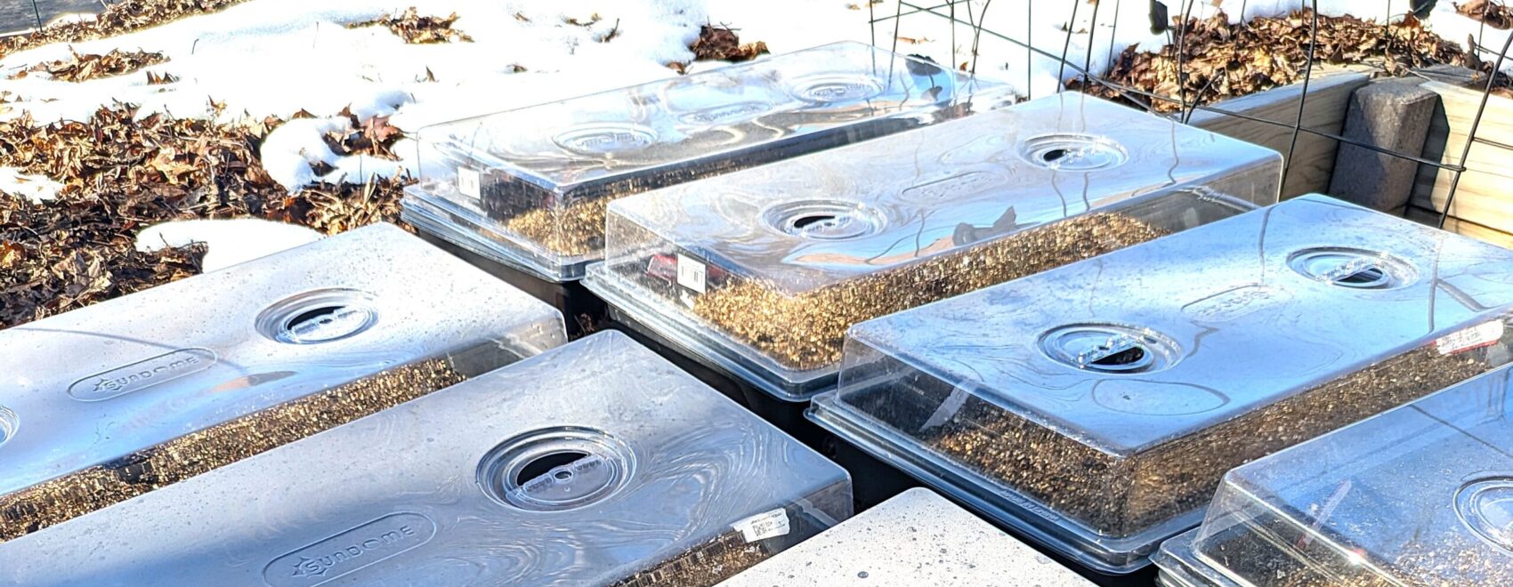 For outdoor cold/moist stratification, the milk jug method is popular. It’s a sustainable way to reuse plastics that might otherwise go to the landfill. You can use milk jugs, juice bottles, or clamshell packages. Use any similar container that provides 3-4 inches of soil depth and 4-6 inches of headspace. At Pollen to Petal, we use nursery flats and humidity domes for better organization in our nursery. We sanitize and reuse our flats multiple times to minimize waste.