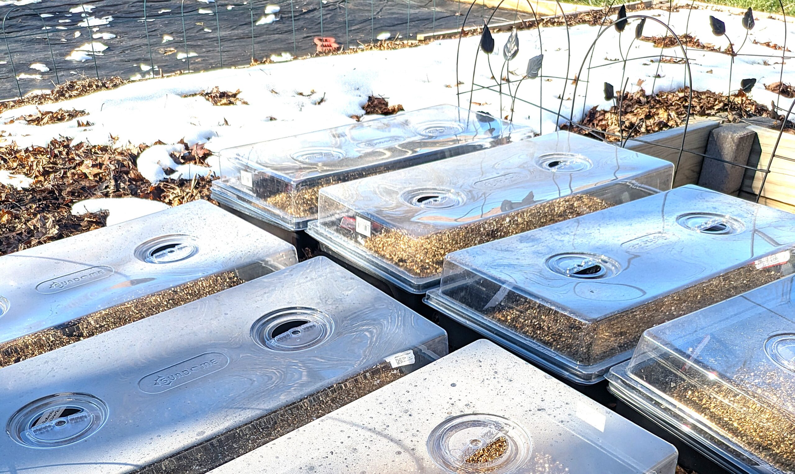 For Outdoor Cold/Moist Stratification, the Milk Jug Method is a favorite! It’s a sustainable way to reuse plastics that might otherwise go to the landfill. You can use milk jugs, juice bottles, or even containers from rotisserie chicken or fruit. At Pollen to Petal, we use nursery flats and humidity domes for better organization in our indoor greenhouse. These flats are sanitized and reused to minimize waste. You could use any similar container that provides 2-3 inches of soil depth and 3-4 inches of space for the seeds to sprout.
