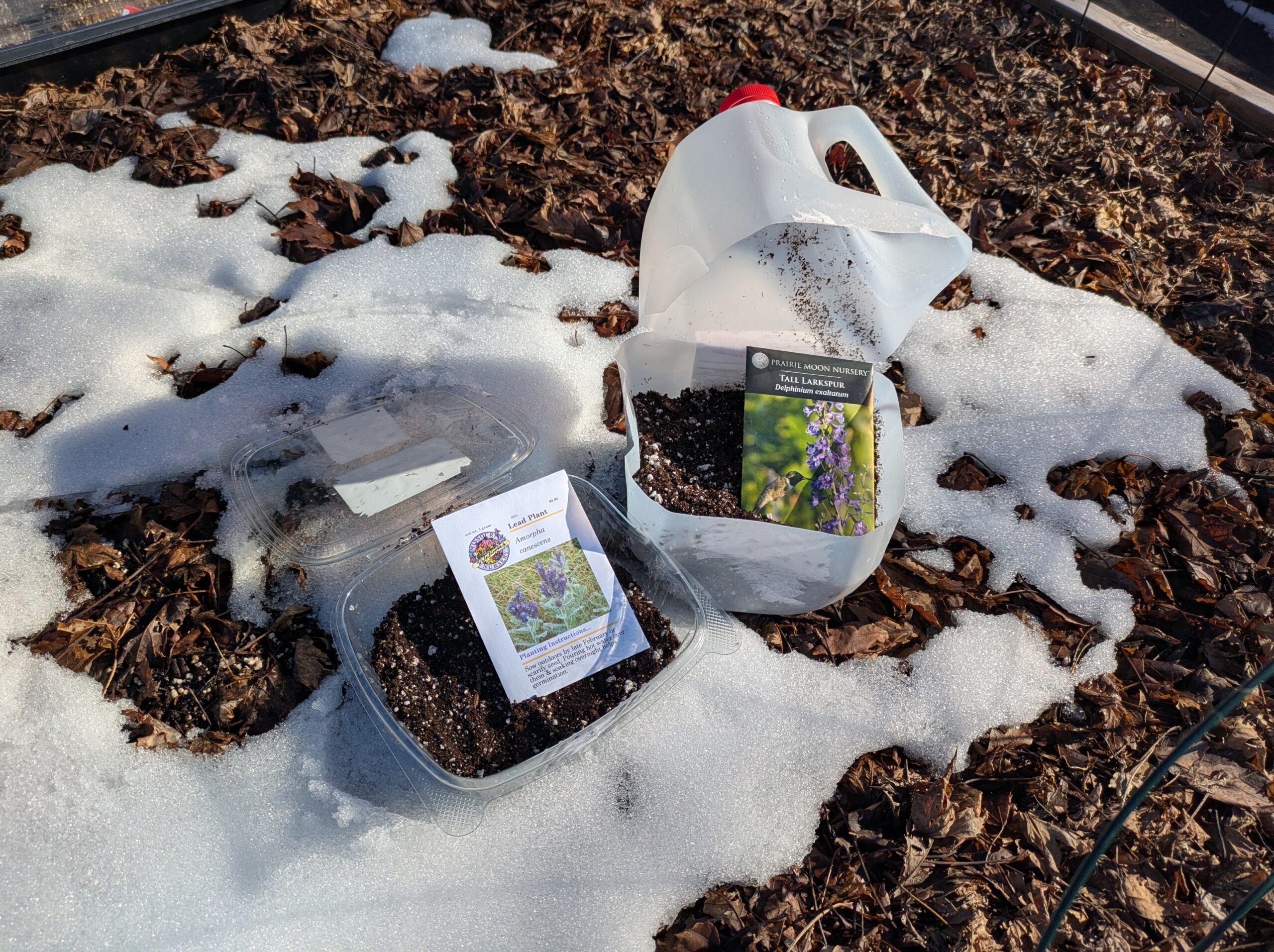 Now, place your containers outside for the winter! I like to put ours against the concrete foundation of our house or in a raised bed with fall leaf litter for slight insulation. This keeps the seeds cold but not frozen. Some gardeners use a blanket over their containers during freezing conditions.